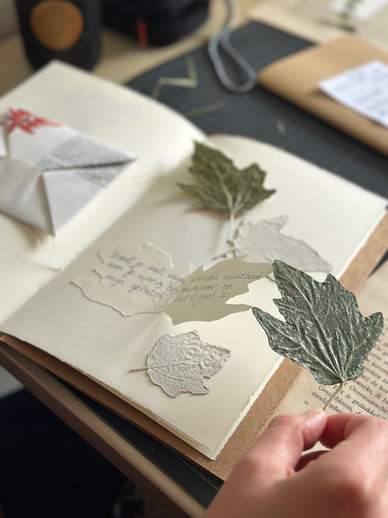 Kom pak mijn hand. Laten we struinen, verwonderen, de tussentijd verliezen. We drogen planten die ons weten te raken. Woorden stromen vanzelf, over schoonheid, de spiegel, de liefde. Alles verwerken we in een bijzonder herbarium. Boekjes, enveloppen en bewaardoosjes door jou met aandacht en liefde gebonden, gevouwen en vorm gegeven.