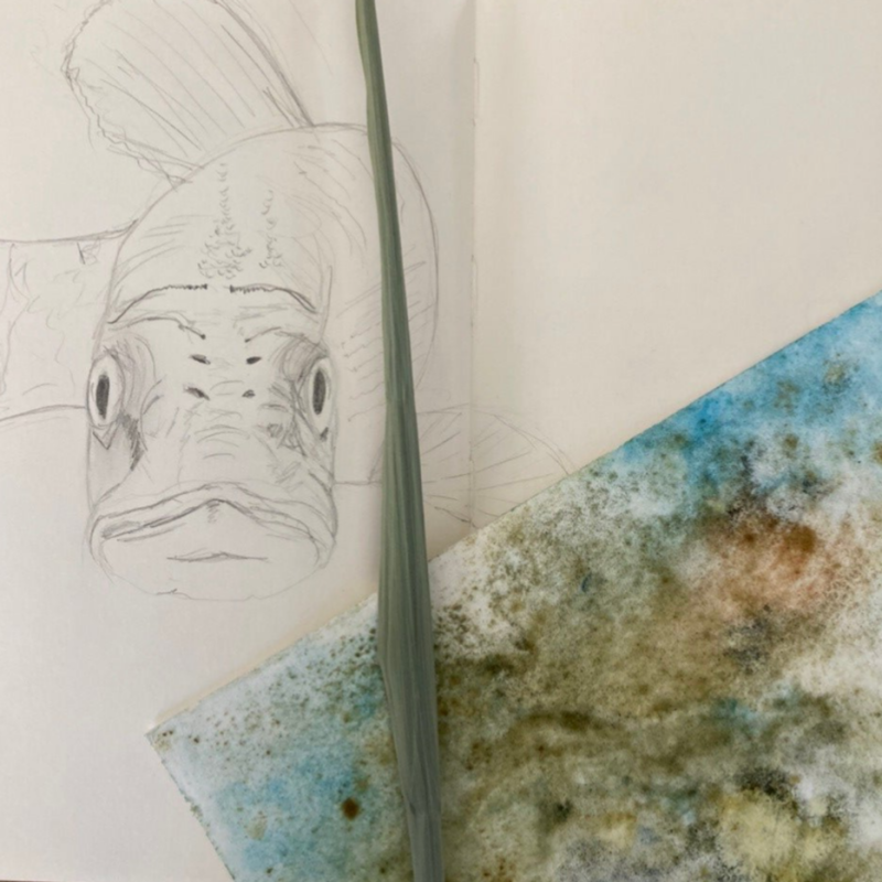 Toch deden de tinten me aan iets denken, namelijk aan een eerder gemaakte tekening van een snoek ofwel de WATERWOLF. Mmmm, ik duik maar weer eens in mijn aantekeningen duiken.
